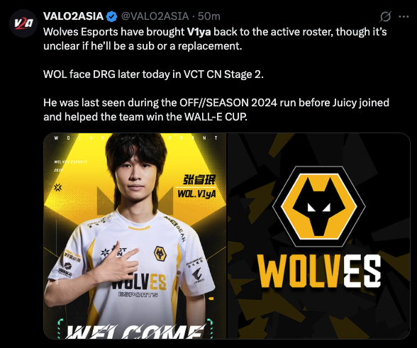 Wolves Esports announced the return of Zhang “V1ya” Ruimin to their VALORANT roster on Saturday, July 26, three weeks into VALORANT Champions Tour 2025 China Stage 2.